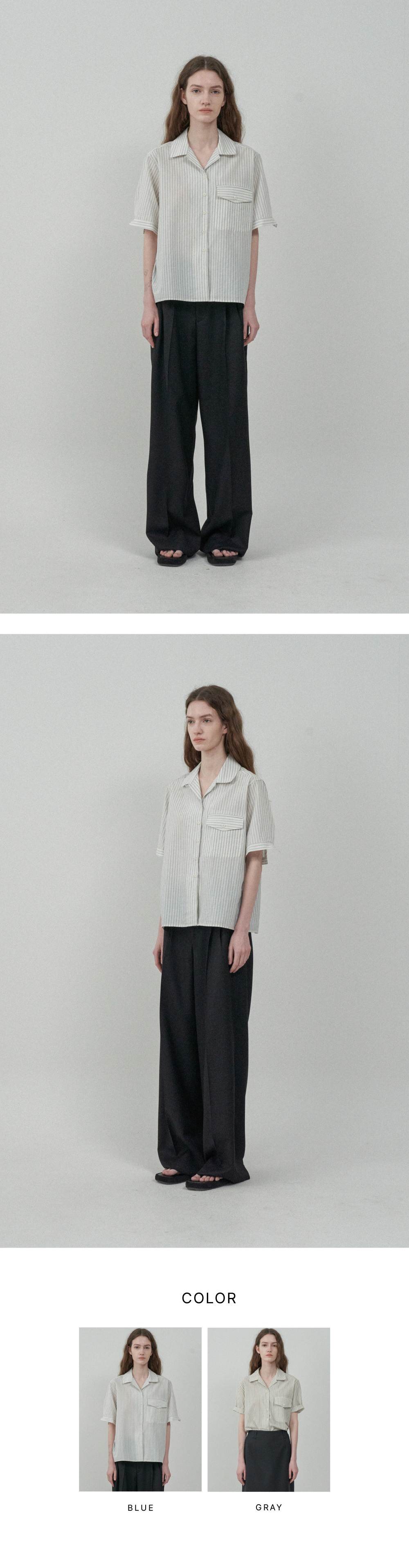 스트라이프 오픈카라 하프 셔츠 - Blue